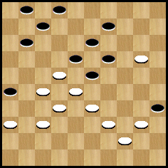 Un souvenir du jeu russe où Kouperrnan a débuté et où la règle de prise majoritaire n’existe pas ? Mais cela n’est pas valable pour Dukel qui n’a jamais pratiqué que le jeu international. Il est incompréhensible qu’il n’ait pas exigé que la prise.1x12 soit annulée en faveur de 18x38. Après le coup joué par Dukel , les blancs perdent :