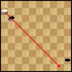 Exemples d’opposition frontale (voir diagramme 1), d’opposition diagonale (voir diagramme 2) et d’opposition latérale (voir diagramme 3). Dans les trois diagrammes, le trait est aux noirs et ceux-ci perdent en donnant leur pion. On dit que les blancs ont l’opposition.